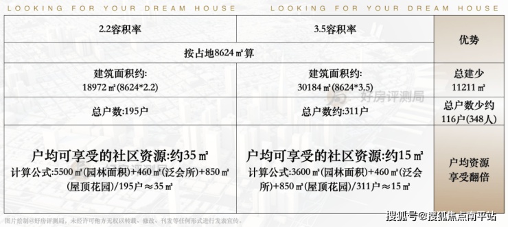 同样地块大小,相比常见的3.5容积率,2.2容积率让社区资源的人均享受面积提升到约35㎡/户,整整提升一倍,相当于家家户户都外挂了一个大花园。