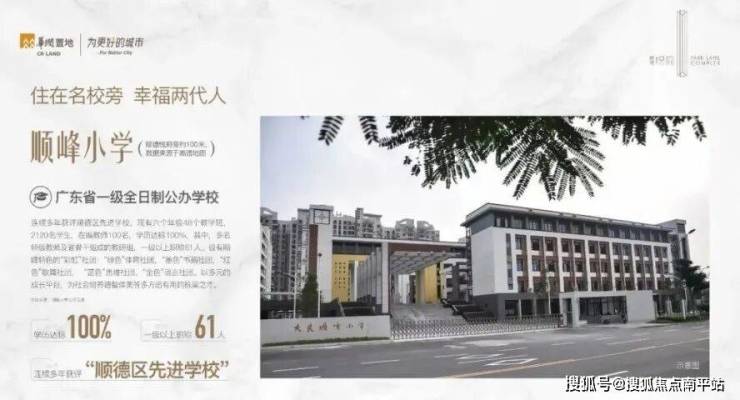 小区门口一路之隔即省一级公办名校顺峰幼儿园、顺峰小学和顺峰初级中学。附近还有大良实验小学、顺德本真未来小学、李兆基中学等,满足孩子3到18岁的全龄段优质教育。