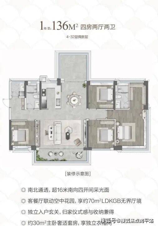 建面约136㎡4房2厅2卫,更是实现南向四开间超16米大面宽,并通过南北通透的客、餐厅、景观阳台、露台构建出空气流通与光线穿透的开阔感。