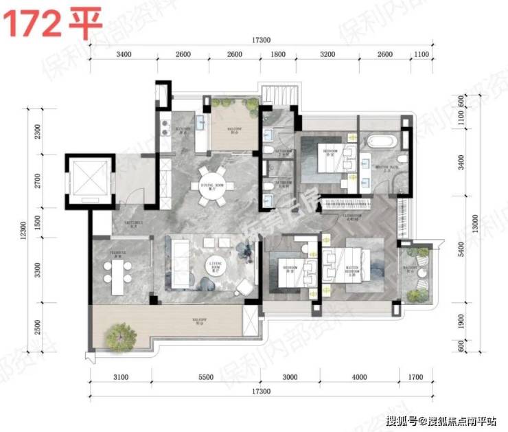 172㎡四房三阳台设计,以及特色L型庭院级阳台,私属领空的意味非常强,大有方便业主指点CBD的感觉;最大客厅阳台8.1米宽,主卧独立超大主卫、景观阳台,能很好营造奢华感,“空中头等舱”不言自明。