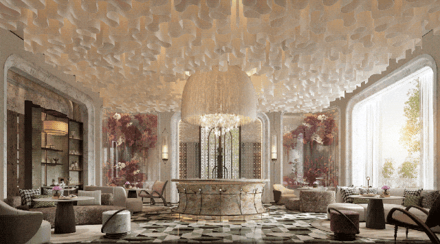 主入口以宝匣启玉为灵感,巧妙地运用弧形线条勾勒出云的灵动与写意,大面积铺设的皇家翠玉石材温润通透,静水前院倒映天光云影,瞬间便隔绝了外界的浮躁。