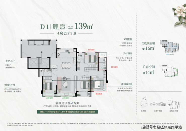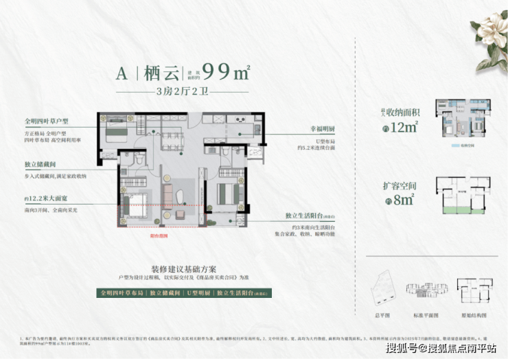 建面约99㎡的户型,把“方正”玩出了新高度 —— 全明四叶草格局几乎零过道浪费,每一寸空间都用在刀刃上。独立储藏间化身“隐形管家”,生活琐物轻松收纳;约 12.2米南向大面宽+三开间全明设计,让阳光成为家里的常客。U 型厨房配5.2米操作台,洗切炒动线丝滑;独立生活阳台将家政、晾晒、收纳一键搞定。
