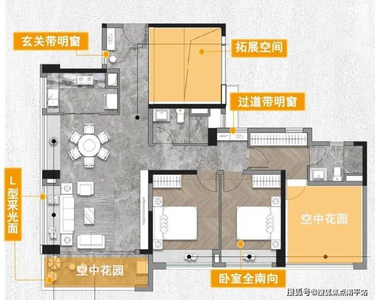 实际上,这是糅合了四合院、胡同、空中园林、空中停车场、电梯房和空中别墅等多种优势于一身,通过客厅与花园双层通高连通,形成内凹式、大进深的空中花园,让高层住宅享受庭院生活。