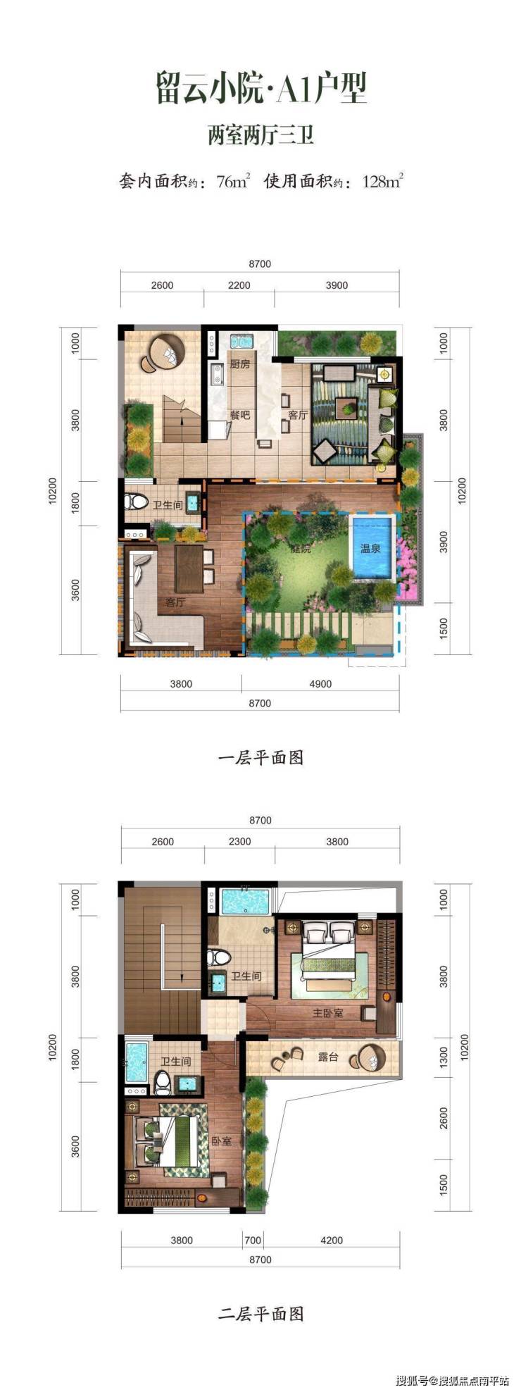 A1留云小院,套内面积约76㎡,使用面积约128㎡,220万起,两房两厅三卫,可改三房,海南稀缺小别墅,独门独院设计,一层大面积私家庭院,带温泉泡池,半敞开客厅,双卧套间。