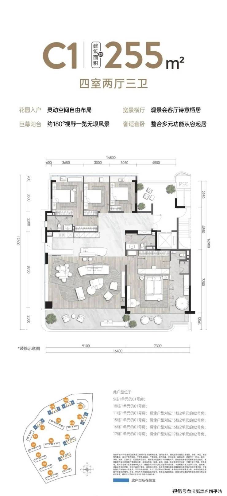在建筑面积约255平米户型中,设计采用私梯入户、阳光电梯厅、入户花园,营造入户礼仪,为业主提供一个私享的归家空间。