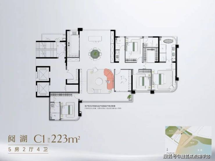 【看湖视野最大化】东南向无遮挡湖景与大中庭园林景观,五开间东南朝向看湖、看溪、看公园,四个房间和客厅阳台均能观赏湖景,主卧和阳台的转角落地窗设计,无遮挡欣赏湖、园、城、溪四重景观;户型看湖面宽约23米,视野开阔。