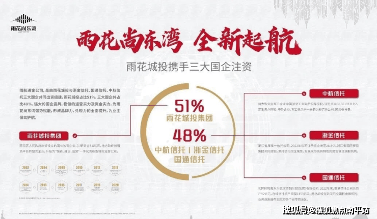国企领航保质量,由雨花城投与浙金信托、国通信托、中航信托三大国企共同出资组建,雨花城投占比51%,三大国企共占比48%