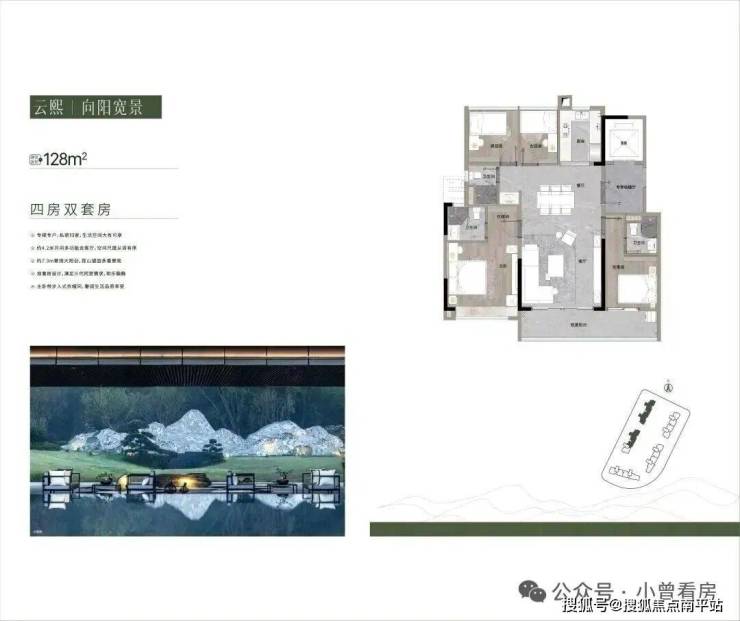 128㎡|四房三卫,专梯专户,私密归家,约4.2m开间多功能会客厅,空间尺度从容有序。约7.3m奢阔大阳台,揽山望园多重景观。