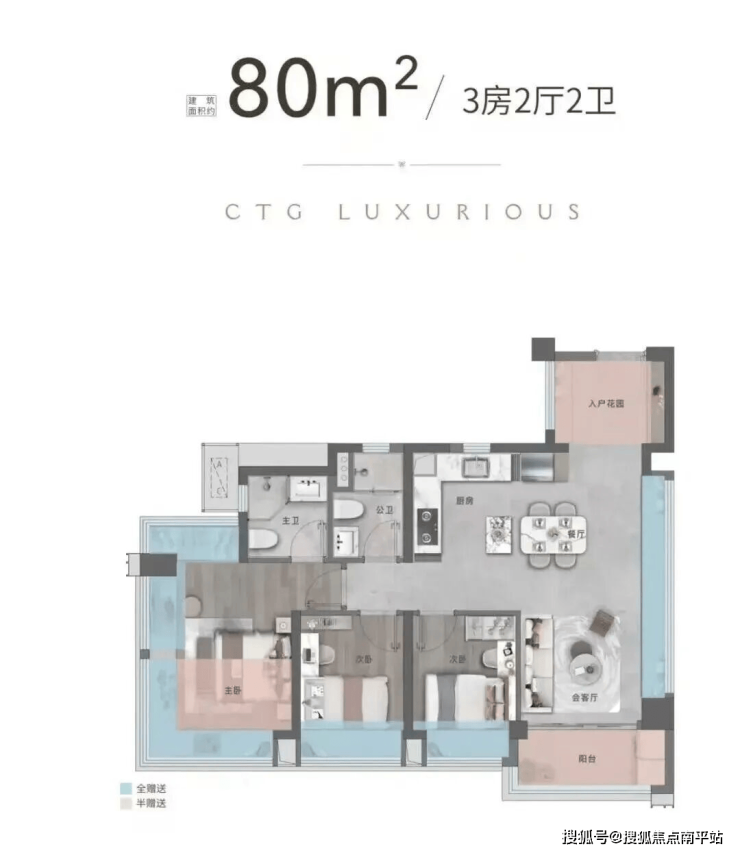 - 80㎡三房(120万起):西北向,13.45米四面宽,入户花园+全屋中央空调,拎包入住。