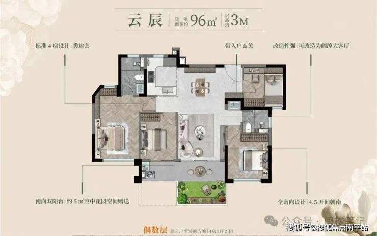小户型侧重 “空间扩容”:95㎡户型实现 4.5 开间朝南,赠送约 26㎡空间(相当于一个标准主卧),实际使用面积接近传统住宅 128㎡;