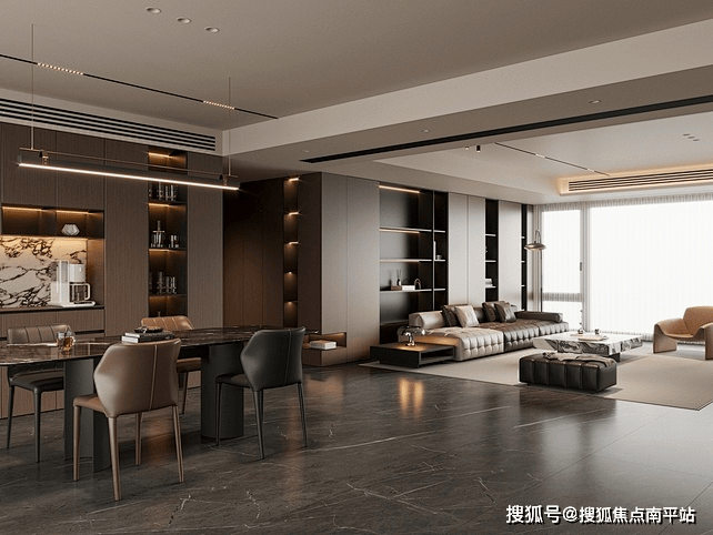 客、餐、厨、阳台联动公区,约52m²奢阔巨厅打破空间的生硬界限, 这里既可容纳数十人的商务宴请与家庭派对,亦可在交互式餐厨空间中,让气派社交与家庭温情并存。