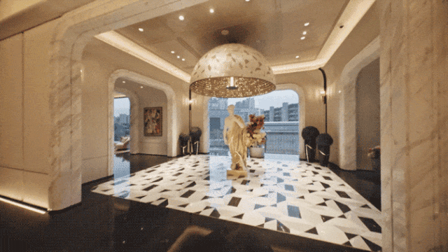 社区门庭以“宝匣启玉”为灵感,尽显归家礼序;庭院门头吊顶运用穹顶设计手法,四方顶搭配采光天窗,寓意财气汇聚。