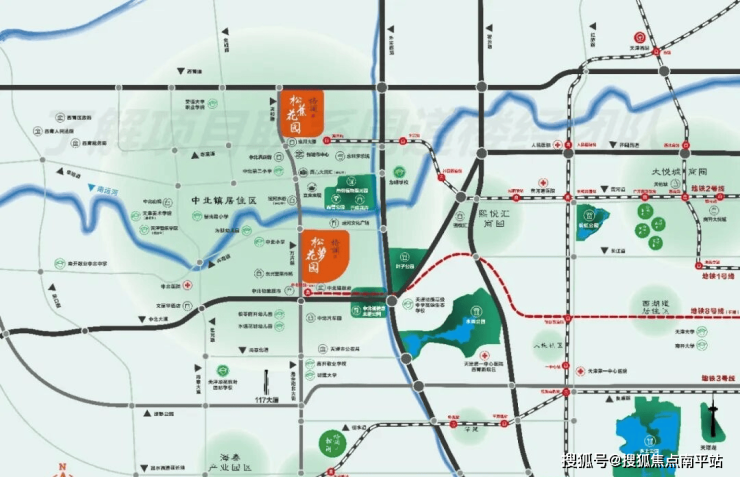 地铁2号线、8号线(在建中)双轨道贯通中北板块:2号线曹庄地铁站,可通达南开、和平;项目紧邻地铁8号线中北镇站,接驳南开、河西、和平;项目地块南邻镇政府,西邻万卉路,实现与南开区、红桥区的快速通达。