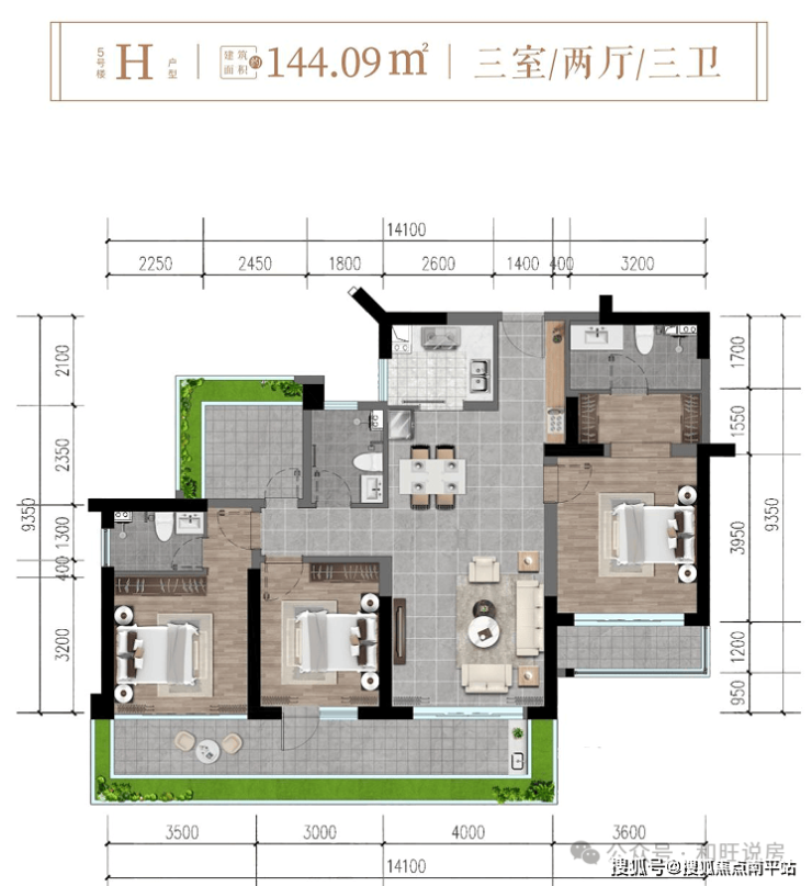 5#楼H户型约144㎡三房两厅三卫