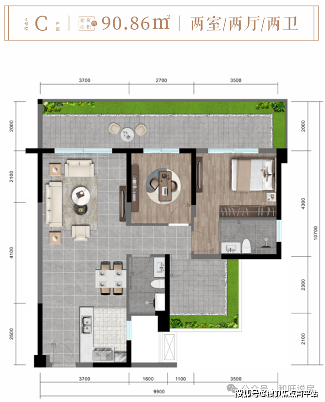 4#楼C户型约90 .86㎡两房两厅两卫