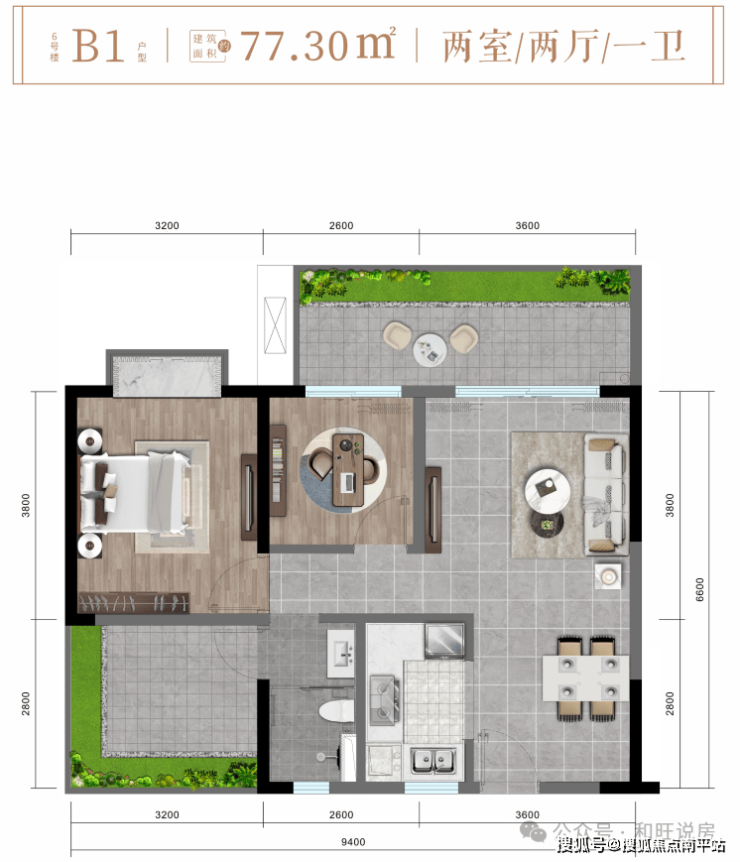 6#楼B1户型约77㎡舒适两房两厅一卫