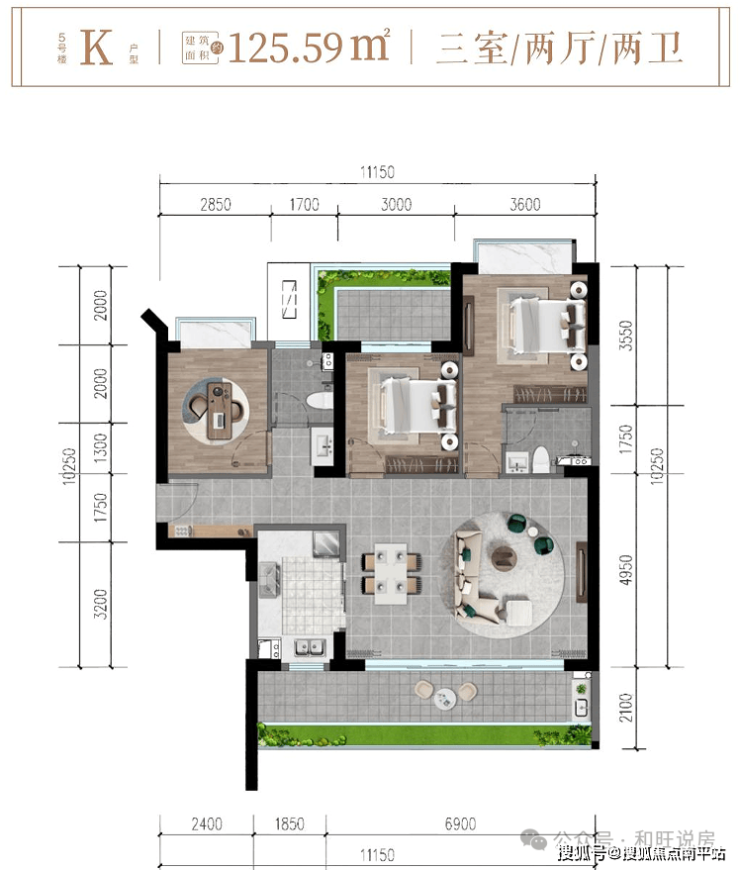 5#楼K户型约125㎡三房两厅两卫