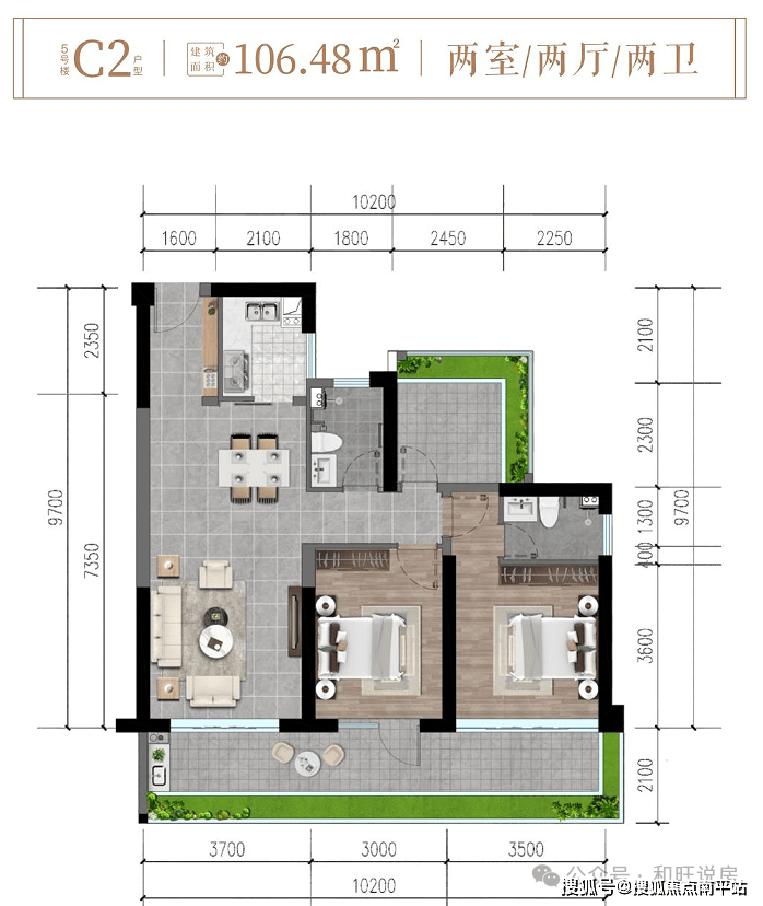 5#楼C2户型约106㎡两房两厅两卫