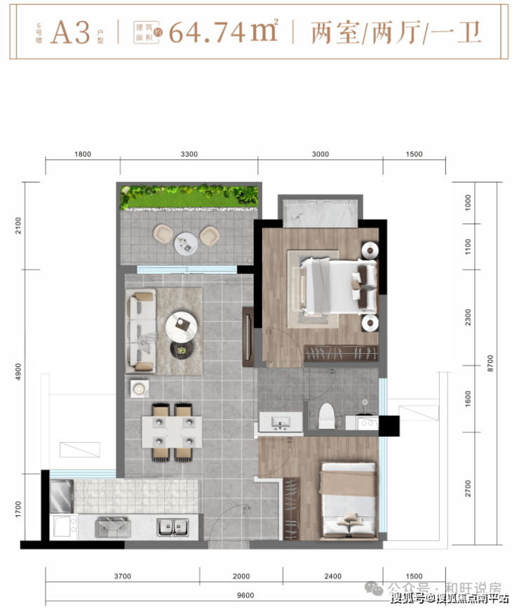 6#楼A3户型约64㎡精致两房两厅一卫