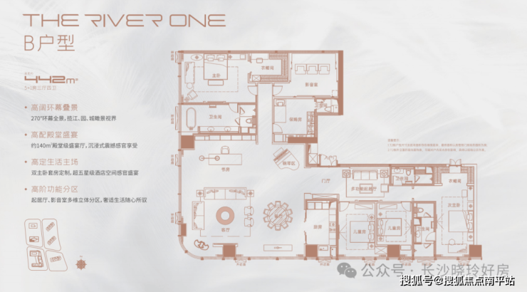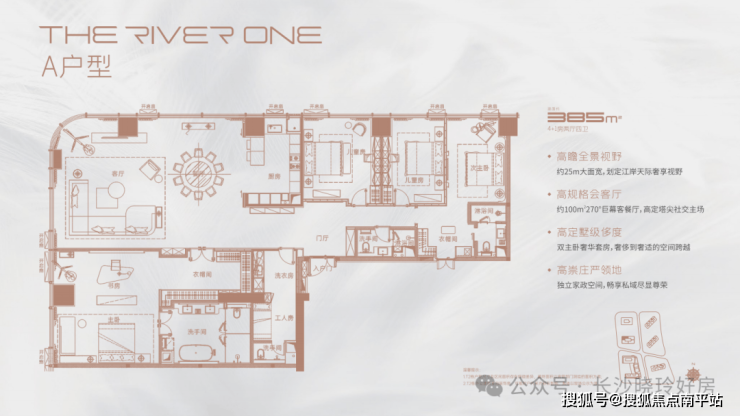 人均百平化起步:打造建面约321-1200㎡江景峯值大平层,超越墅级生活侈度。