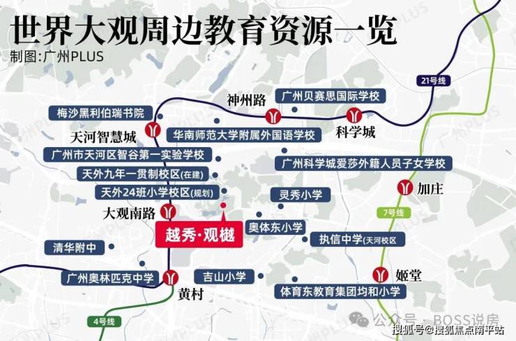 小学:配建 24 班小学,引进广州天河外国语教育集团合作办学,周边 3km 内有 15 个小学,包括奥体东小学、广州思源学校小学部等。