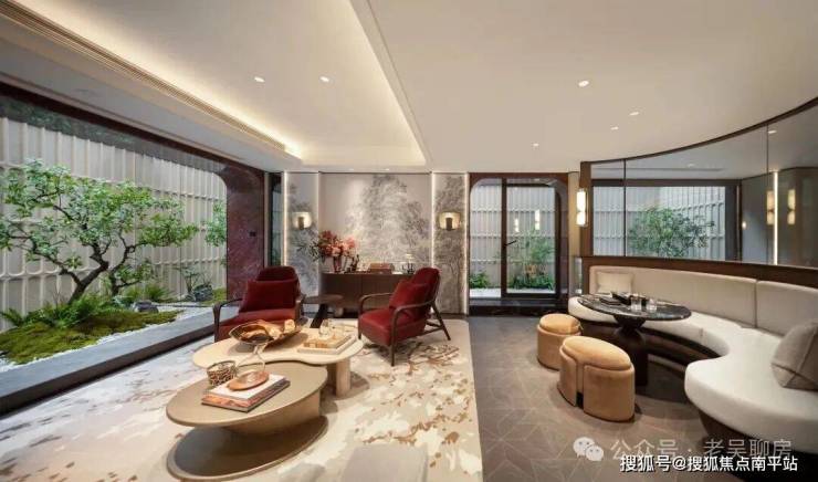 庭院中央采用巴西进口亚马逊绿奢石打造的流水景台,单价高达约4000元/㎡,配合灵感源自复兴公园紫藤廊架的景墙,潺潺水声与静谧光影,共同凝筑成一个静谧诗意的角落(项目红线外不作为交付承诺)