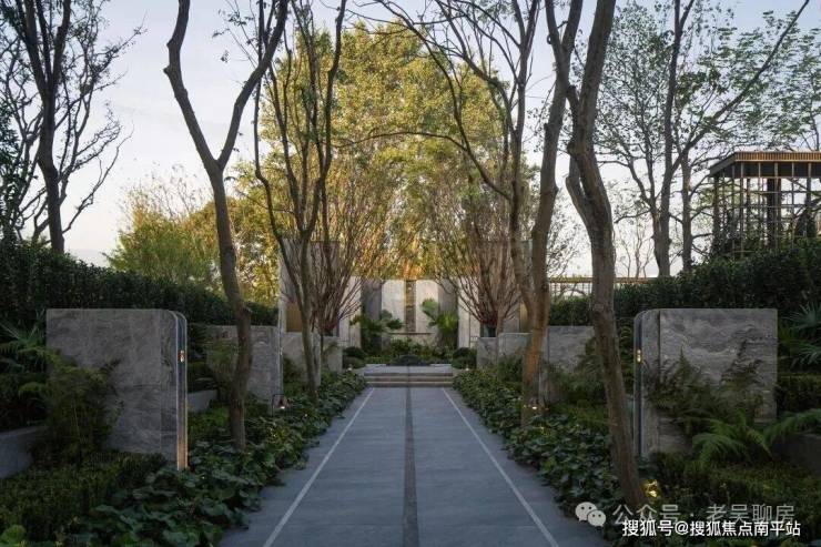约100米长的私家礼道,两侧4米高景墙庄严夹道,整整齐齐的香樟树撑起"绿色的华盖"