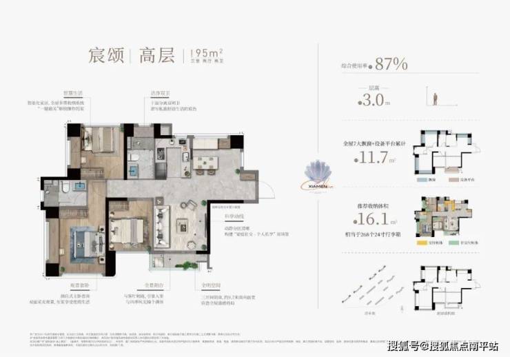 整个户型都是大玻璃面,即便是餐厅位置都有双面玻璃采光,而且是别墅级的岛台设计。主卧和次卧更是双面飘窗观景。产权不大,但可用面积很大,实际得房率有87%。而且标配的层高3米。