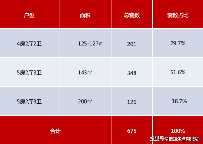 户型分布:主力户型三个面积段 125-127㎡四房(占比 29.7%)、143㎡五房(占比 51.6%)及 200㎡大平层(占比 18.7%)。整体户型采取了新规的设计,得房率相对较高。