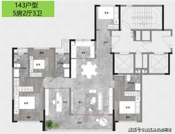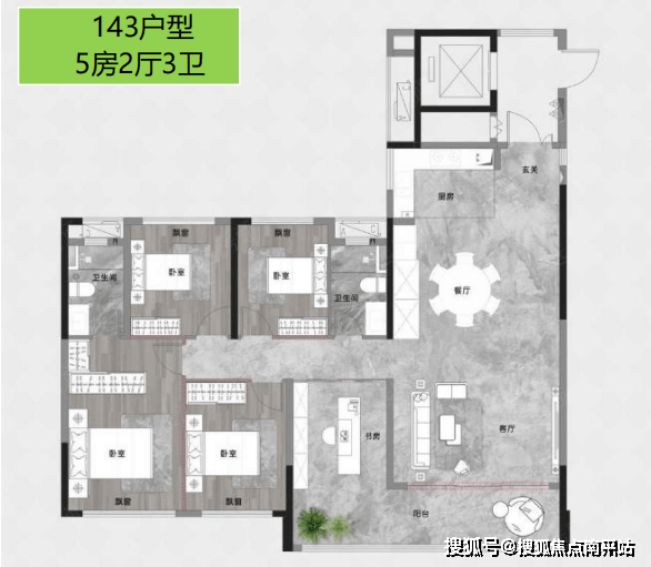 5房3卫格局,2T2户,电梯私梯入户,南向四面宽,阳台面宽7.6米,采光面大,主卧有独立的衣帽间,实用面积约153m²,得房率约104.3%,但玄关处有点浪费。