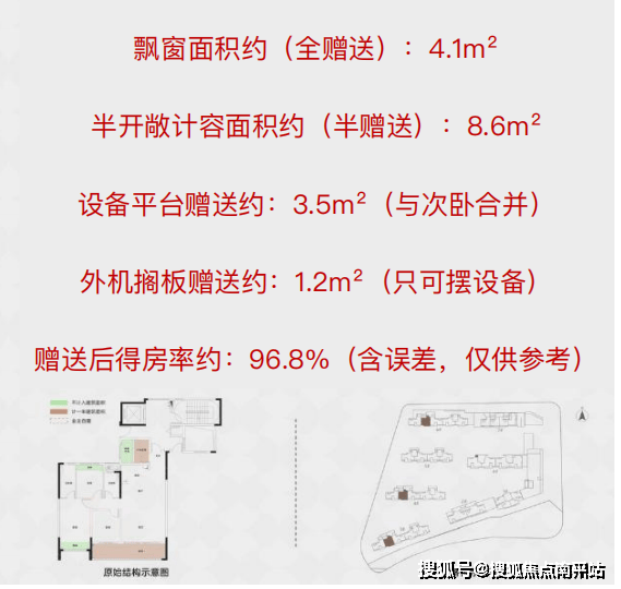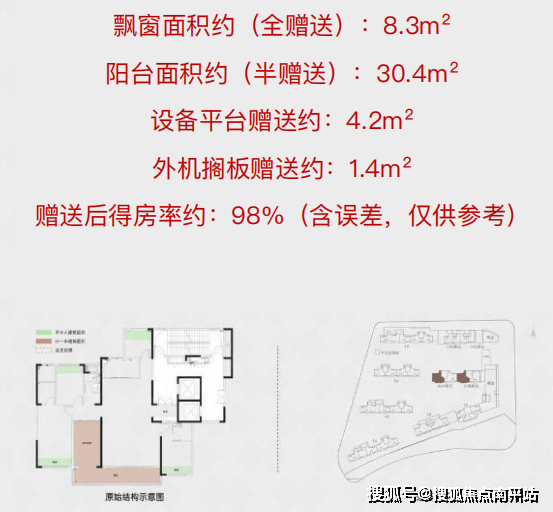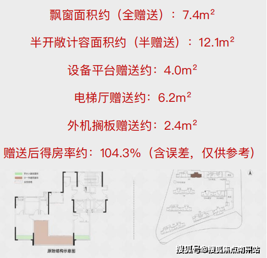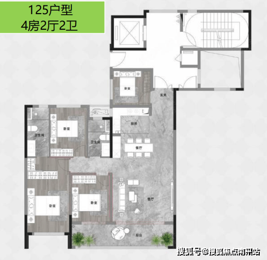 4房2卫格局,客厅面宽4.5米,阳台面宽7.3米,客厅可与南向次卧打通;形成超长的南向采光面。全赠送的全屋飘窗+ 半赠送的生活阳台和设备平台,实用面积约117m²,初步算得房率约96.8%。
