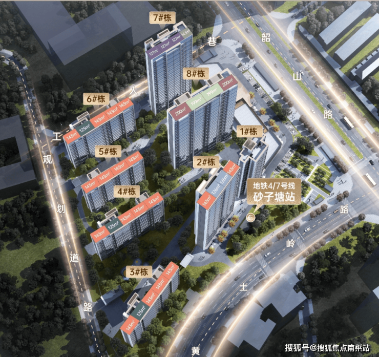 规划布局:采用 “高层 + 小高层” 混布局。西侧 3-6# 栋为2T2/2T3户16层小高层,东侧沿韶山路 2#、7#、8# 栋为 31 层高层(2T2 户)和底商;1# 栋的回迁房布置在东南角为T4的独立分区、单独入户(可以避免商品房住户与回迁住户入户交叉)。整体东高西低布局,能够一定程度上将韶山路的主干道的噪音进行阻隔。