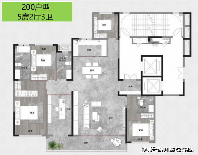 5房3卫格局,独立电梯厅,四开间+南向面宽16.4,采光面好,2T2,客厅6.1米开建,书房+客厅,空间舒适,实用面积约184.6m²,得房率约98%。