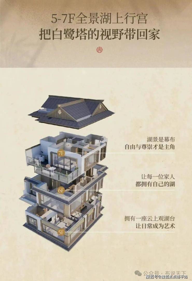 共计三层楼(5-7F), 全占270°无遮挡观湖视野,东、南、西三向瞰湖,好似一处“云上观景台”,以更开阔的视野、更广的采光,塑造了更高品质的立体式湖畔墅居生活。