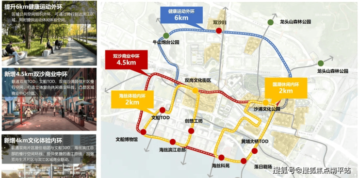 构建“两轴、一带、三廊、三环”的慢行系统网络,三环分别为6公里运动外环连接滨江,4.5公里商业中环连接华润万象系TOD商业,4公里文化体验内环连接各重要空间。