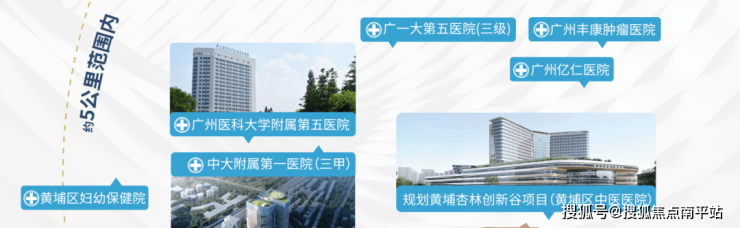 附近几所三甲医院中大附属第一医院(三甲),广医大附属第五医院(三甲)、黄埔区中医医院、广州市黄埔区妇幼保健院等,都在2公里之内。