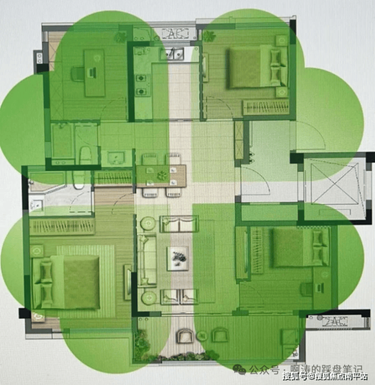 ·135平: 餐客厅居中,四个卧室分布在四角,常规四叶草户型。
