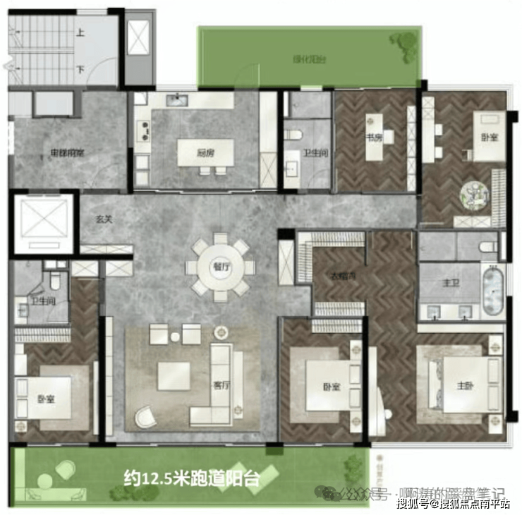 ·165平: 常规飞机户型,双主套,南北双阳台,客厅、主卧都是南北对流,那个十字长中轴主卧,太气派!