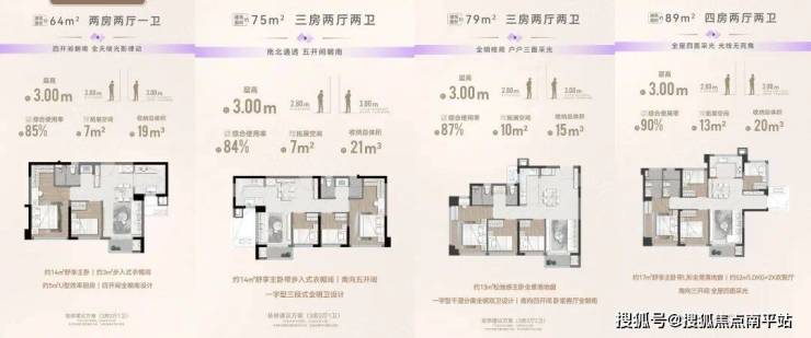 1、高层+洋房组合:4栋高层+5栋洋房,产品线丰富,64㎡两房三开间朝南、75㎡三房四开间朝南,采光好、空间利用率高;89㎡边户四房更是亮眼,小预算也能买四房;
