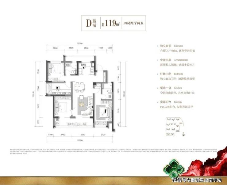 建面约119㎡精致四居,难得一遇的边套南厅舒适格局,约6.5米阳台无界连通餐客厅及独立玄关、套房式主卧,直接带来居住感受的实质性跃升。