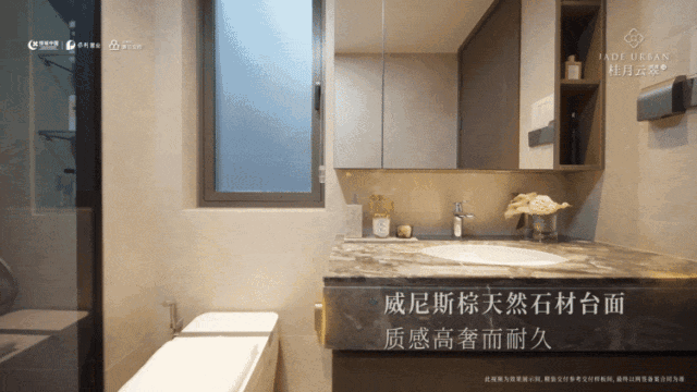 ◈一体化台盆吊柜:威尼斯棕天然大理石台面,质感高奢;台下盆收纳柜整体吊装,延伸收纳空间;侧面壁龛,让护理用品、香薰等各安其位。