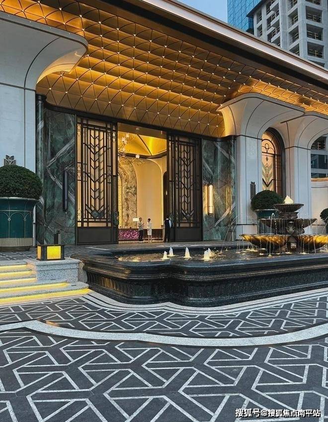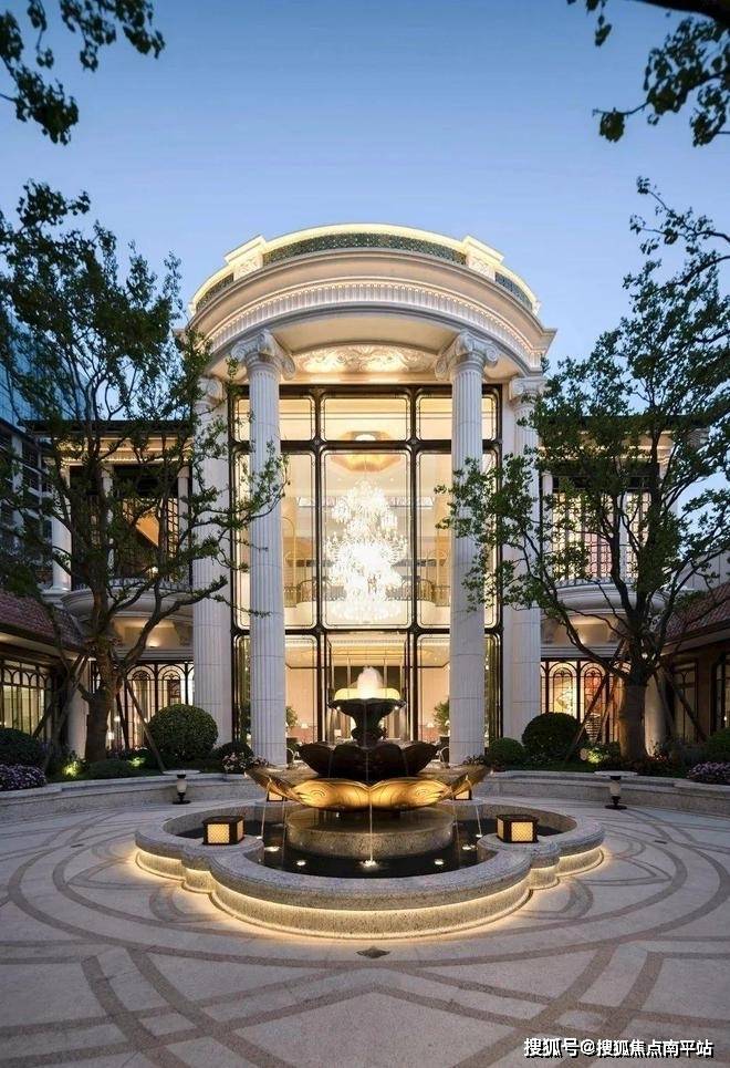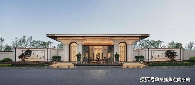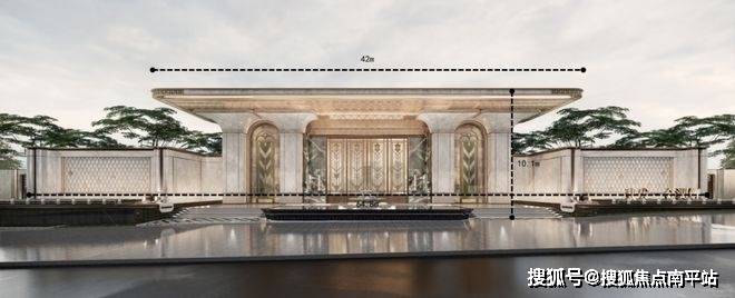社区西大门主体高12m,宽45m,当居住者穿过大门,空间的序列变化赋予归家过程强烈的仪式感,同时大尺度的设置也传递出豪宅应有的尊崇氛围。大门主体与两侧延伸段景墙连为一体,整体长度达 71m。宏大的尺度构筑起气势恢宏的门头,成为社区与城市的视觉分界。精妙的细节无不在显示着其制作的奢华精美。