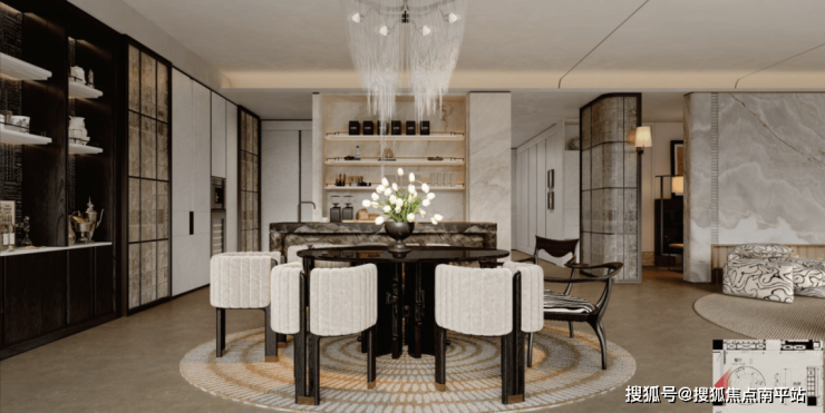 350户型以精致沉稳的东方隐奢风格为主线,定制贝母入户门与高级灰石材地面奠定奢雅基调。空间通过深浅色调对比、PU皮革与浅色奢石的材质碰撞,营造张力与温度;弧面天花则以柔和造型平衡视觉,共同打造出兼具力量感与雅致氛围的居所。-具体更多详情,拨打售楼热线:☎️☎️400-159-8559转接7788【售楼中心】