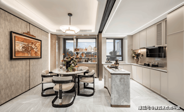 此次对外开放的还有建筑面积约143㎡户型样板间,将东方雅韵与当代艺术凝练为一场空间诗学。空间以“揽阅风华”为轴,打破传统隔阂,构建开放而有序的生活剧场。客厅、餐厅与景观阳台无缝串联,通高玻璃幕墙将自然光引入室内,光影在米白与香槟金的底色上流转,仿若一幅动态的抽象画。