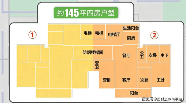 其次是145㎡四房三卫,这是项目最小面积的双套房户型,分别位于#3栋、#6栋、#7栋和#10栋,货量最大。