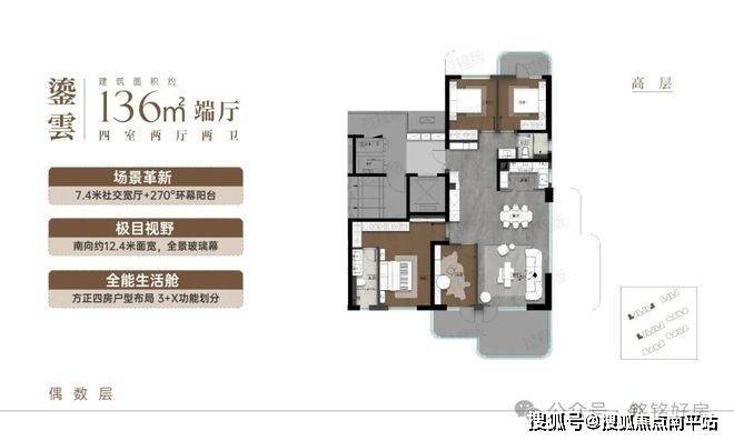 :仅136㎡(高层)、166㎡(洋房)两种面积段,一梯两户私家电梯厅,全四房设计,精准锁定高端客群。