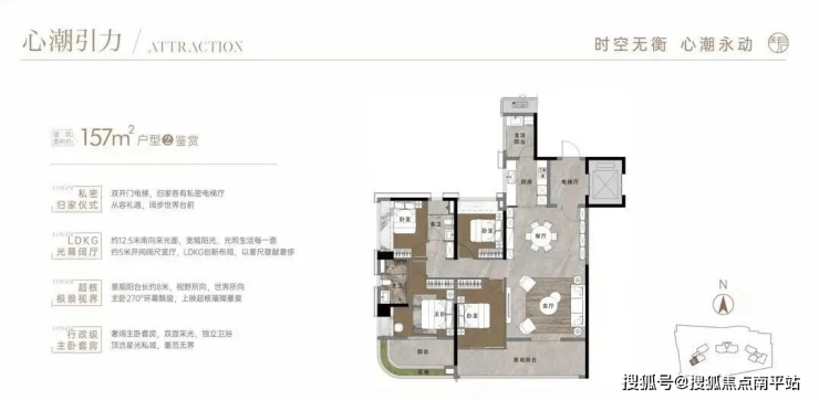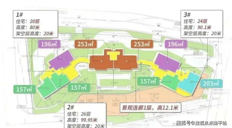 1栋位于小区西侧,20层高,两梯三户且做到专梯专户,户型涵盖157-196平。