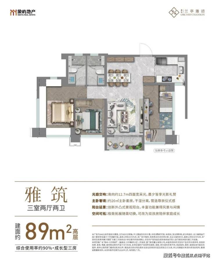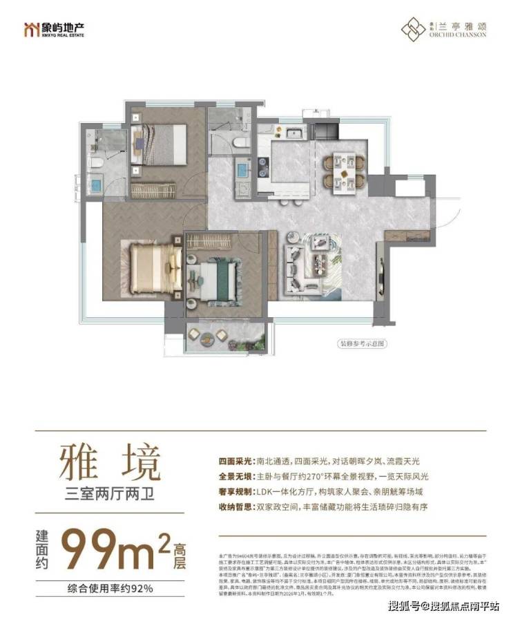 综合使用率约92%,南北通透,三开间朝南,四面采光,270°全景餐厅,LDK一体贯通餐厨+大方厅,享大平层尺度;270°全景主卧南北通透,享奢阔空间;户户享独立外阳台。