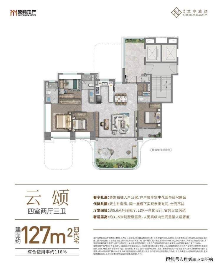别墅级层高约3.15米,综合使用率约118%-120%,相当于200㎡独梯独户大平层;超四代住宅,南北双花园;6米面宽楼王级横厅+LDK一体餐厨空间+超大露台,享豪阔起居生活空间;主卧270°全景天幕、双台盆设计。