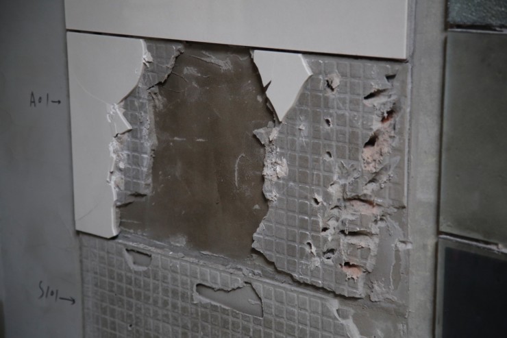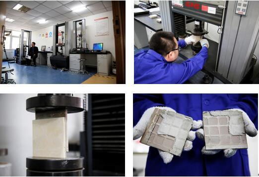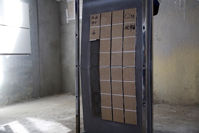 实验结果大致为1列仅残存两块瓷砖;最严重变形的2、3列位置上瓷砖毫无变化,能看到比较出色的抗形变能力;4列虽然仅涂瓷砖胶,但同样瓷砖毫无变化。